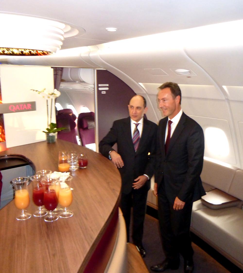 Qatar Airways Group CEO Akbar Al Baker and Airbus president and CEO Fabrice Brégier tour the lounge on the upper deck, which is located between the business- and economy-class sections. ATW Photo: By Kurt Hofmann