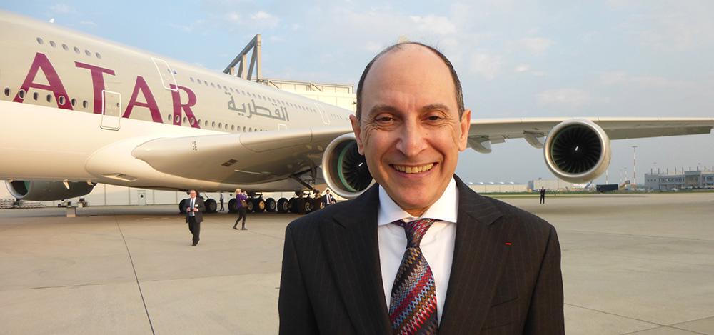 Qatar Group CEO Akbar Al Baker in front of the newly delivered A380. ATW Photo: By Kurt Hofmann