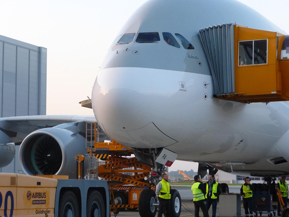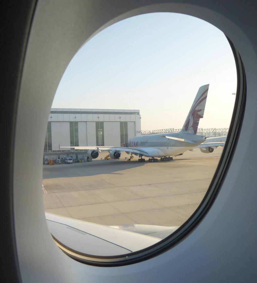 Qatar A380 awaits pushback for delivery flight to Doha. ATW Photo: By Kurt Hofmann