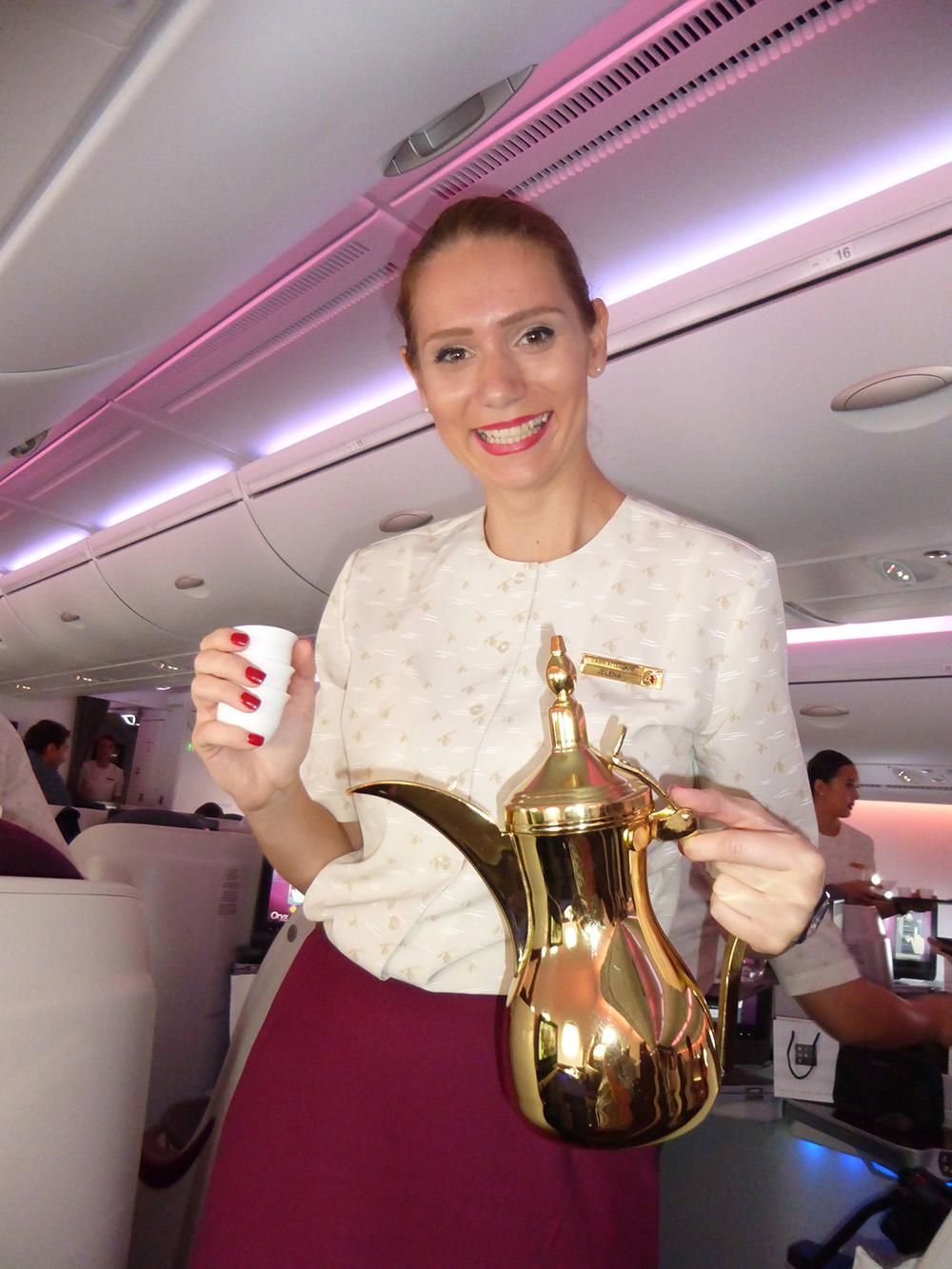 Qatar A380 flight attendant serves Arabic coffee. ATW Photo: By Kurt Hofmann
