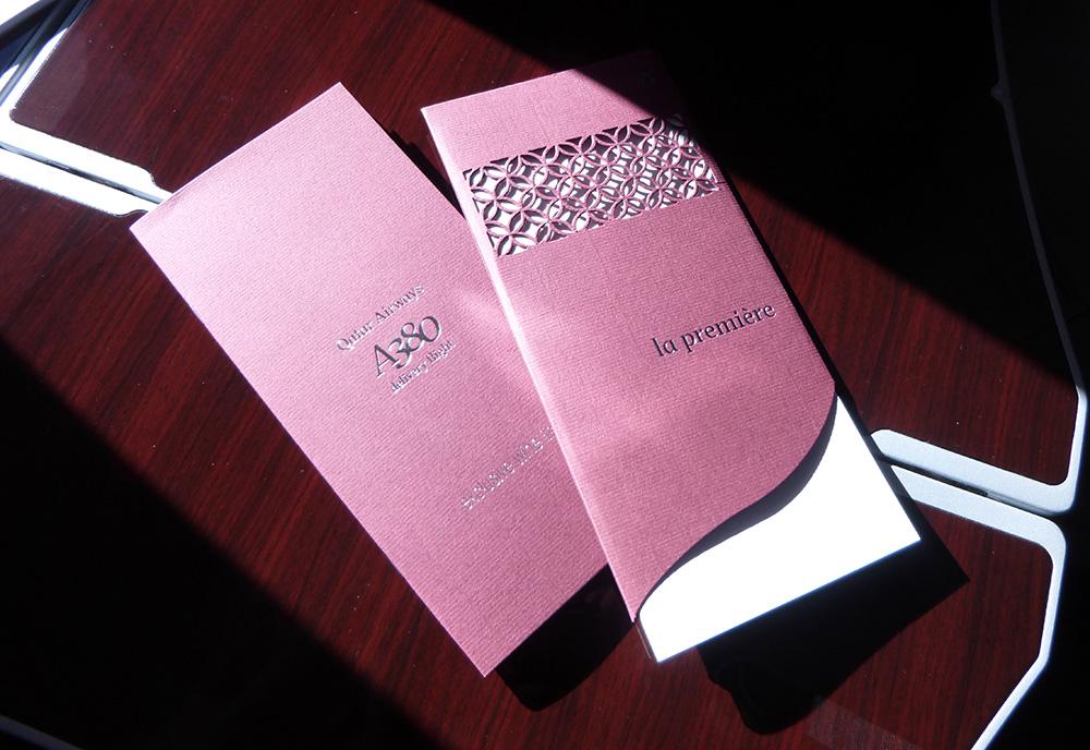 Qatar A380 special dining cards. ATW Photo: By Kurt Hofmann