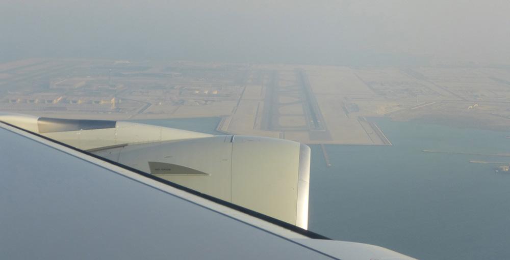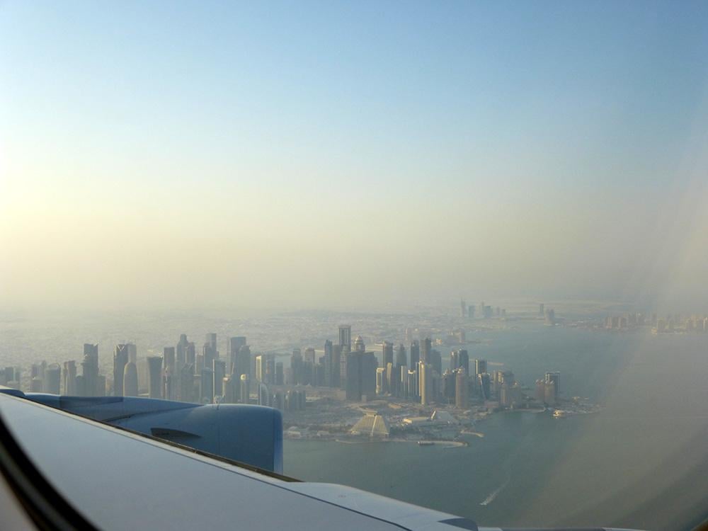 Qatar A380 closing in on downtown Doha. ATW Photo: By Kurt Hofmann