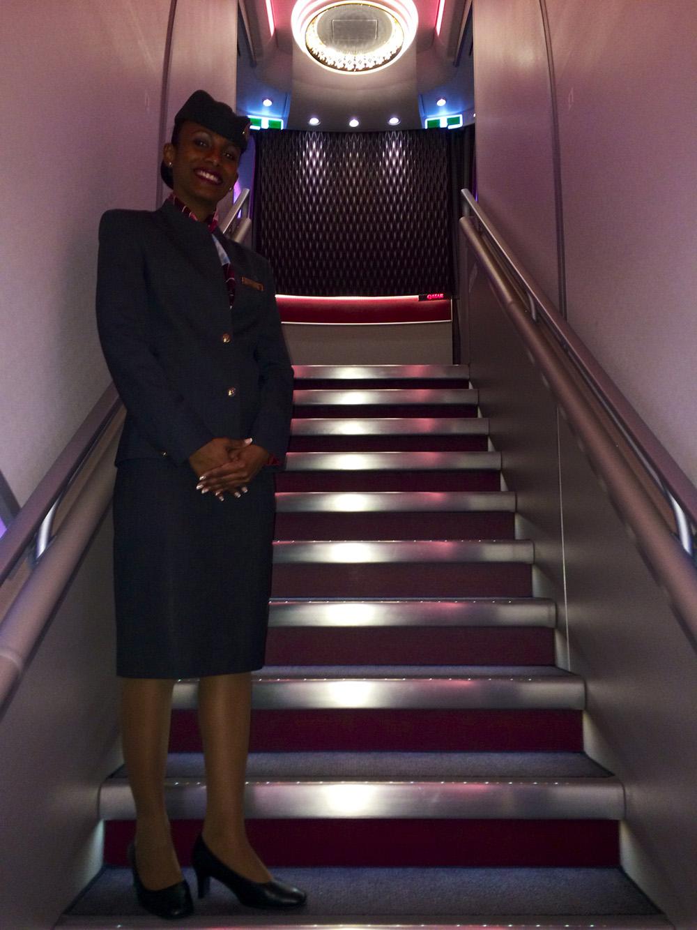 Upstairs to first class on the Qatar A380. ATW Photo: By Kurt Hofmann