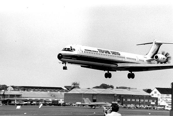 The McDonnell Douglas Unducted Fan does a flyby at the Farnborough Air Show in 1988. The MD-81 testbed is seen in a video here