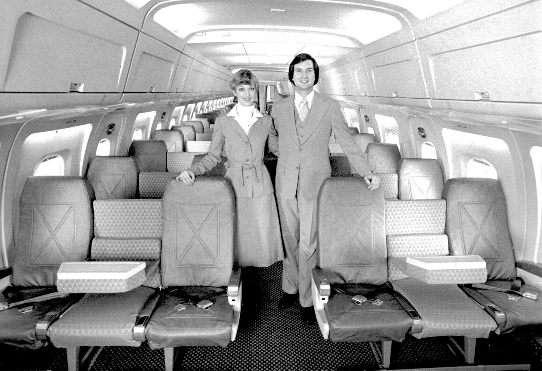 Caption, November 29, 1978: Additions to Braniff International's fleet of intercontinental McDonnell Douglas DC-8-62s will be equipped with Atlantic Aviation’s “wide-body look” interior system, as seen here on one of their eight -62s already outfitted.