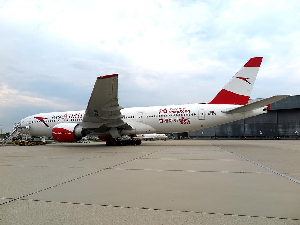 Lufthansa Group subsidiary Austrian Airlines launched 5X-weekly Vienna-Hong Kong services Sept. 5, its third destination in China after Shanghai Pudong and Beijing. Photo: Austrian Boeing 777 in special Hong Kong livery.