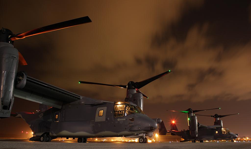 A pair of 20th SOS Ospreys drops by for a top-off at Key Field Airport in Meridian, Mississippi, on Nov. 5, 2015.