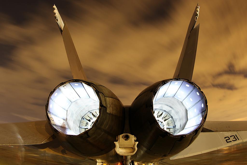 Sunlight paints the afterburner on a Boeing F/A-18 on the general aviation ramp at Milwaukee