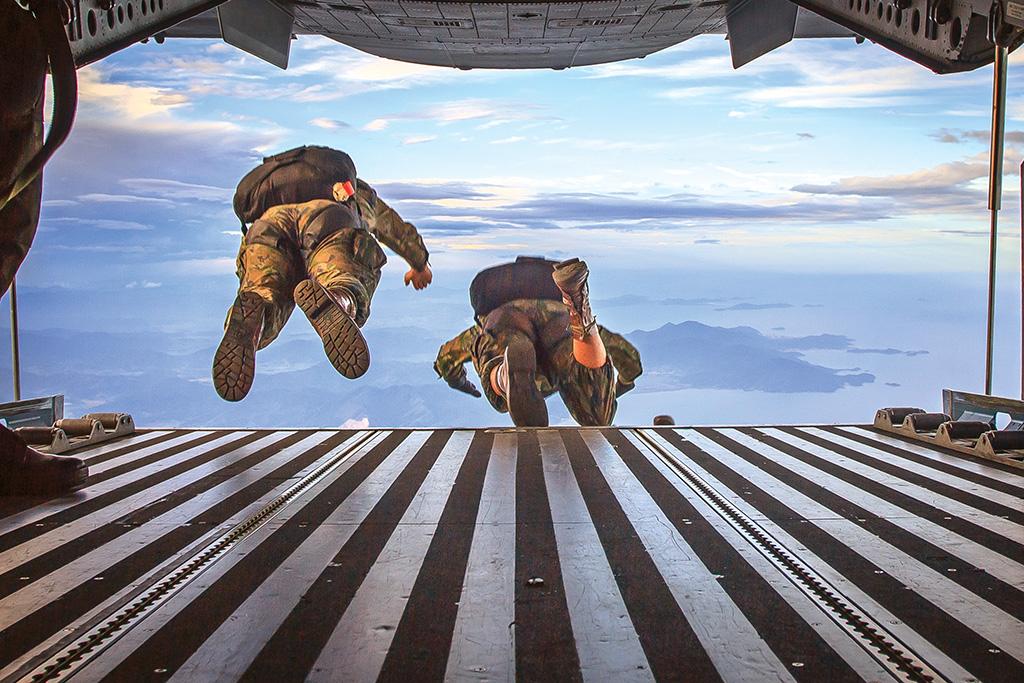 Two rescue jumpers plunge from an SC-105 Amazonas (CASA-295) over Santa Catarina, Brazil’s Atlantic shore.