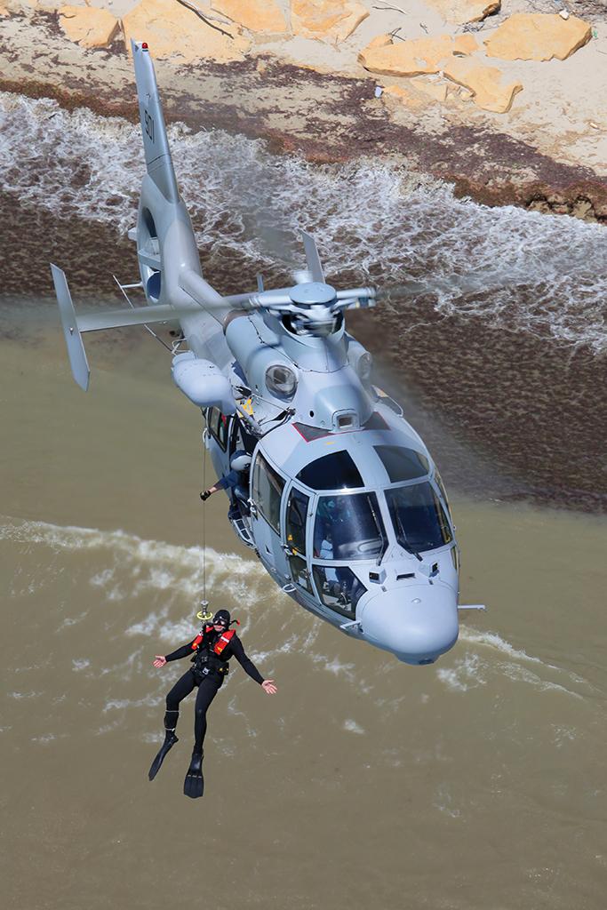 Bulgarian navy AS-565MB Panther hovers during a search-and-rescue training flight over the Black Sea coastline of Bulgaria.