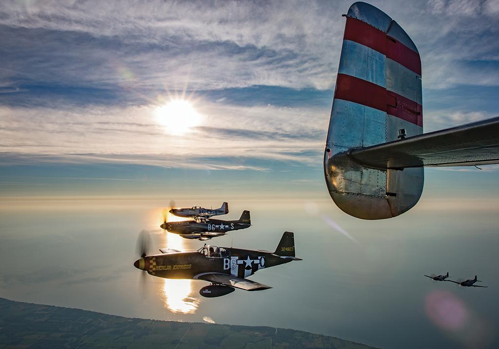 A flight of P51 Mustangs in formation next to a B25 over Lake Michigan near Sheboyagan, Wisconsin, on July 24, 2015.