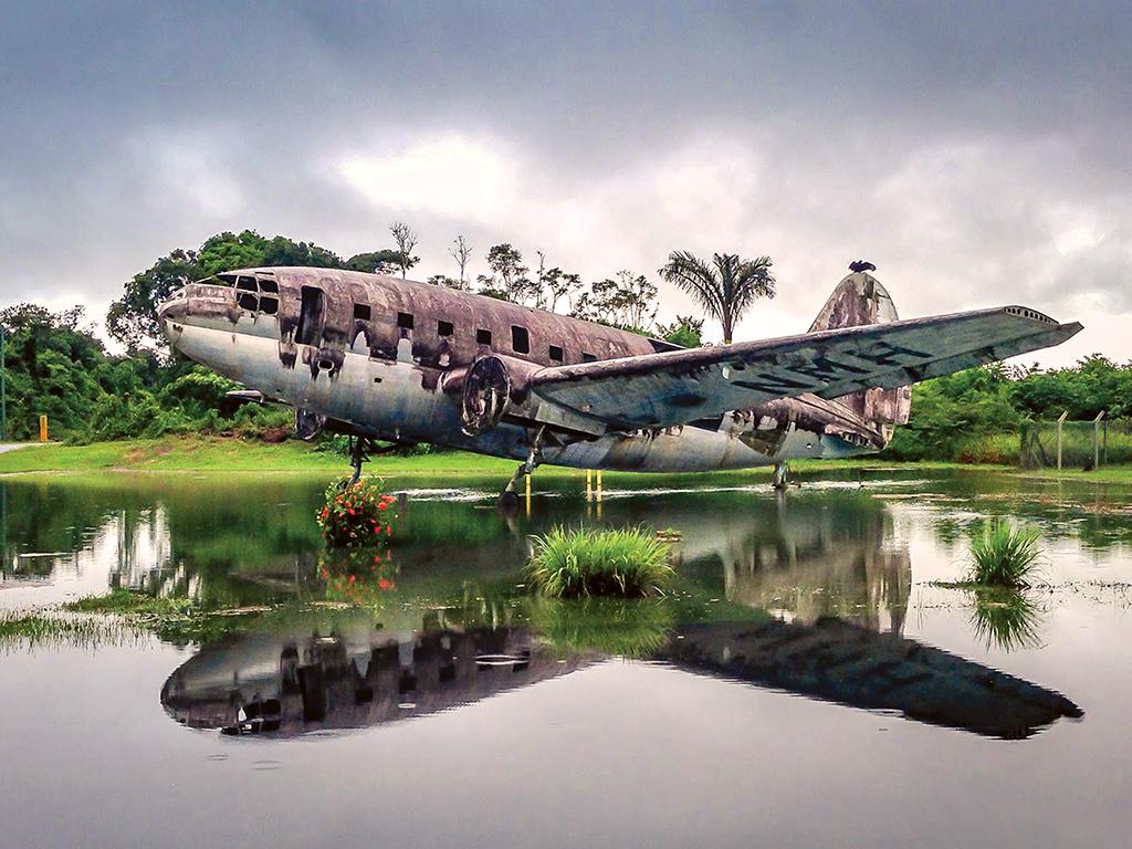 An abandoned twin-engine transport sits in the Brazilian rain forest near Itacoatiara.