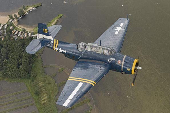 An overhead view of a Swiss-registered Grumman Avenger TBM-3R flying over Lake Veluwe during a visit to the Netherlands.