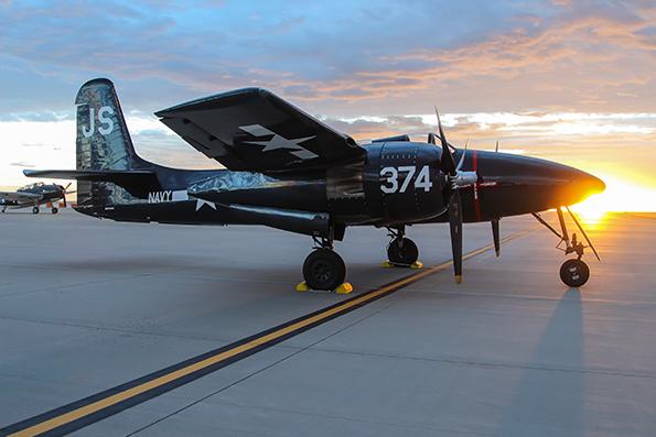 A Grumman F7F Tigercat at sunrise before a rainstorm at the Pikes Peak Regional Airshow in Colorado Springs.
