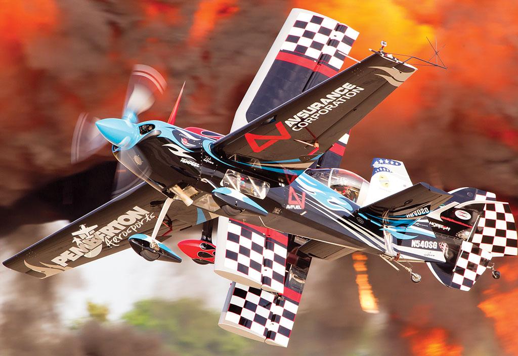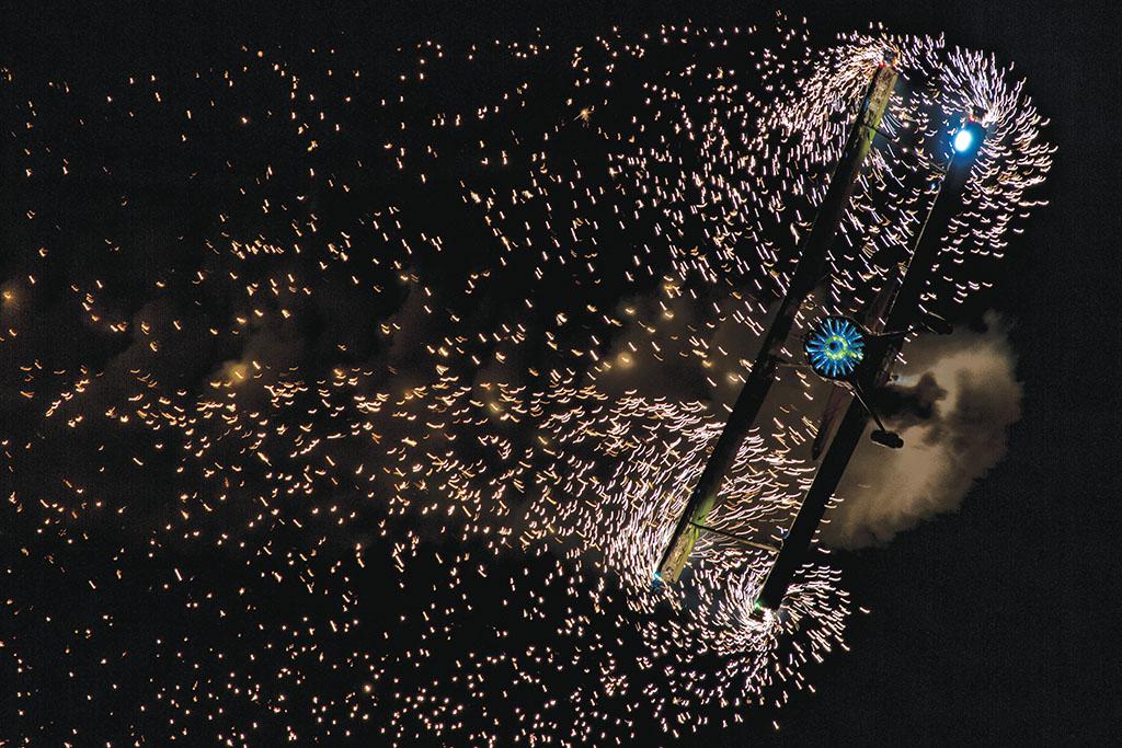 Gene Soucy performs a nighttime pyrotechnic routine in his Showcat Grumman biplane at the 2014 EAA Airventure Oshkosh (Wis.). The fireworks create a visual display of wing vortex. Photo by Evan Peers, San Carlos, California.