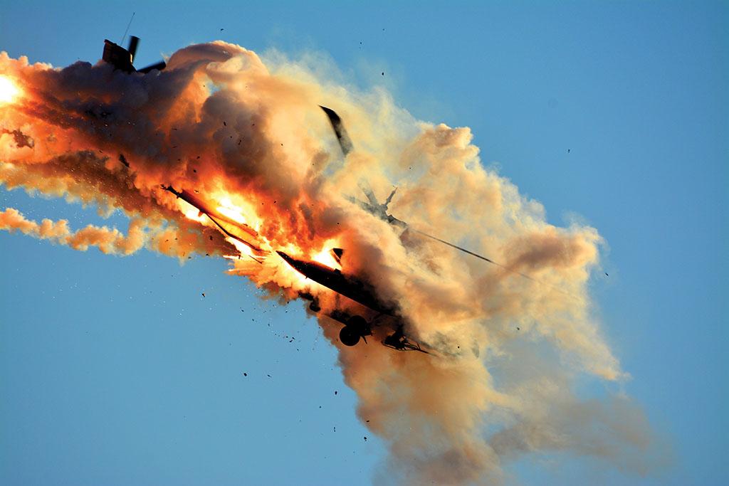 Stunt aircraft flown by Skip Stewart and Melissa Pemberton cross in front of “wall of fire” at EAA Airventure 2014. Photo by Ricardo von Puttkammer, New York, New York.