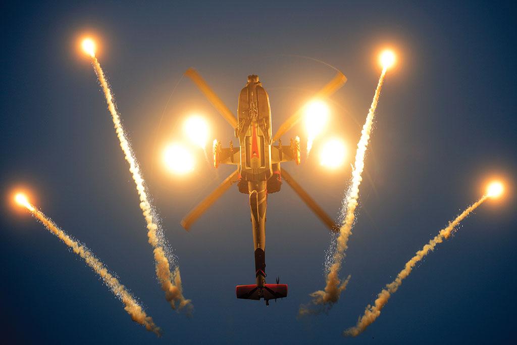 A Royal Netherlands Air Force Boeing AH-64 demonstrates its flare capability at sunset near Sanicole, Belgium. Photo by Benoit Denet, Rixensart, Belgium.