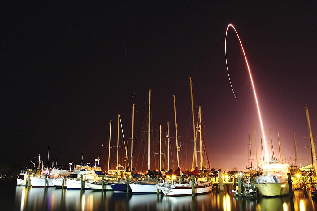 The GPS IIF-5 spacecraft ascends through a clear night sky aboard a Delta IV rocket on Feb. 20, 2014, creating a beautiful arc over the masts of sailboats moored at a Titusville, Florida, marina. Photo by John Moss, Viera, Florida.