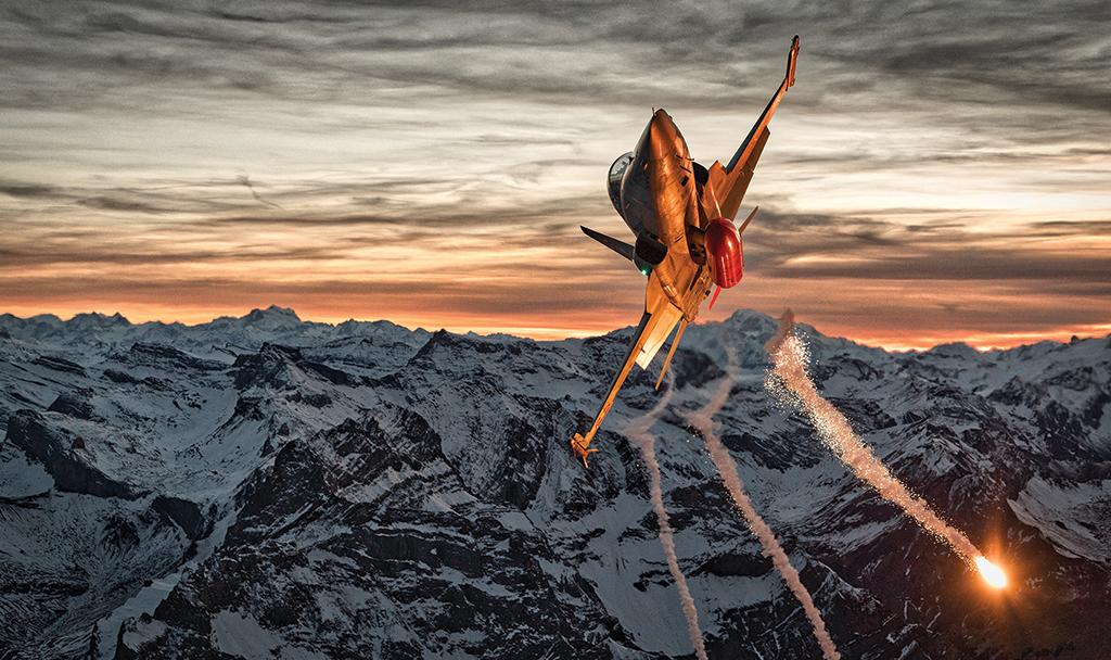 A Swiss Air Force F-5E Tiger II releases flares after sunset over the Bernese Alps.