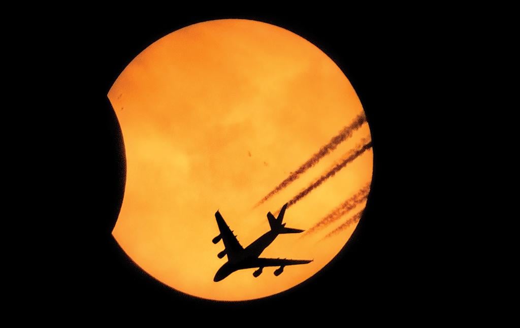 A huge Airbus A380 is framed by the solar eclipse on Aug. 21 amid sunspots and a layer of clouds.