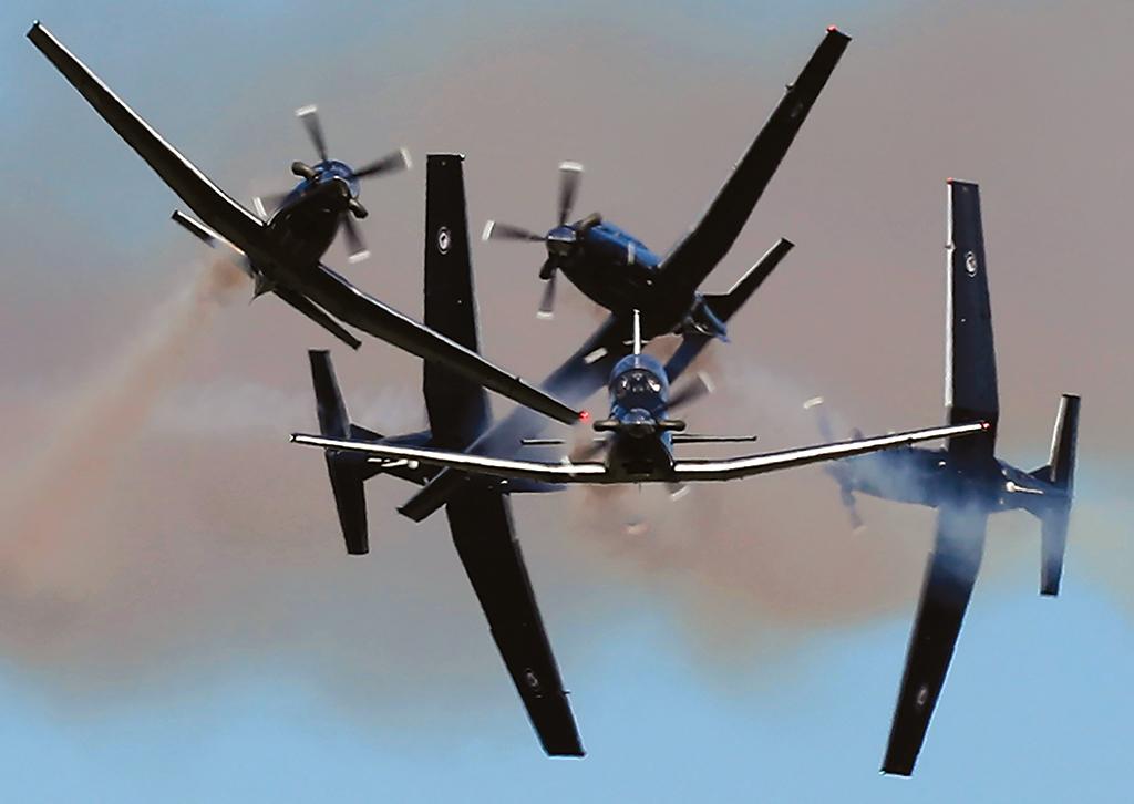 The Royal New Zealand Air Force Black Falcons team performs a spaghetti break in their new T-6C Texan ll aircraft at the 2017 Classic Fighters Airshow at Omaka Aerodrome, Marlborough, New Zealand.