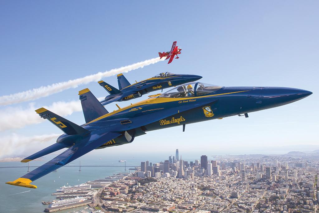 The U.S. Navy Blue Angels Nos. 5 and 6 soar above San Francisco, with legendary aerobatic pilot Sean D. Tucker in the Oracle Challenger III during Fleet Week 2017.