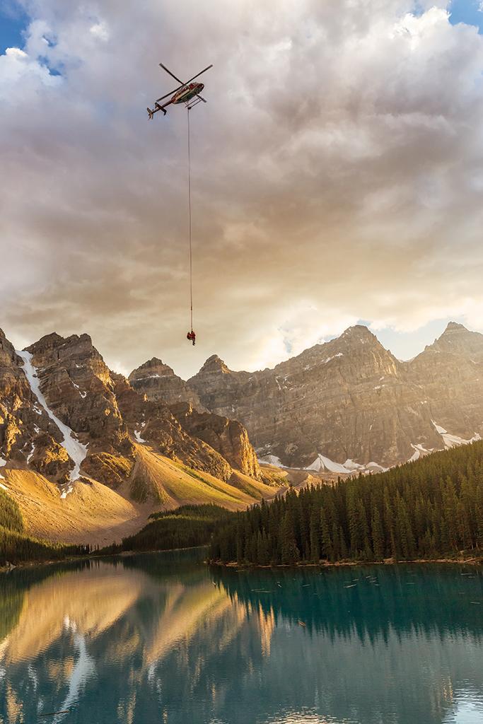 A dramatic helicopter rescue is captured over Moraine Lake in Alberta.