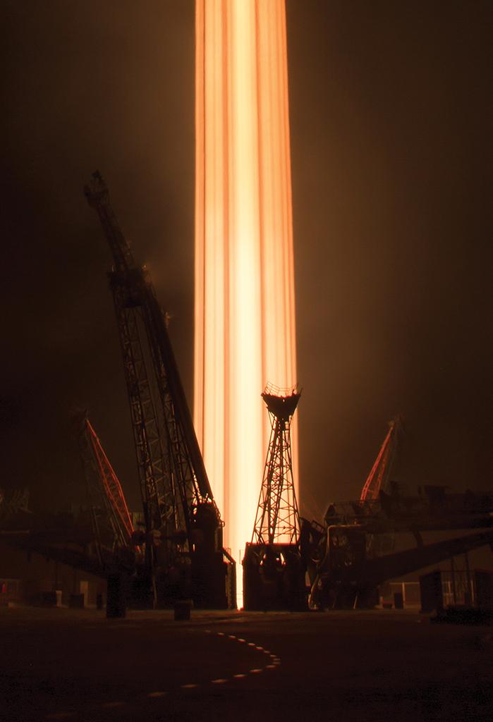This long-exposure shot captures a Soyuz MS-03 spacecraft launching from the Baikonur Cosmodrome in Kazakhstan carrying Expedition 50 crewmembers to the