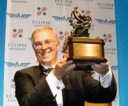 Eclipse Aviation CEO Vern Raburn proudly holds high the Collier Trophy he received at the annual awards presentation in Washington, D.C., in May.