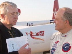 Senior Editor Craig Covault (left) interviews pilot Steve Fossett at the Kennedy Space Center about fuel issues on his upcoming "ultimate flight" around the world. In the background is the 114-ft.-wingspan Scaled Composites/Virgin Atlantic GlobalFlyer aircraft. Fossett plans to stage the flight from...