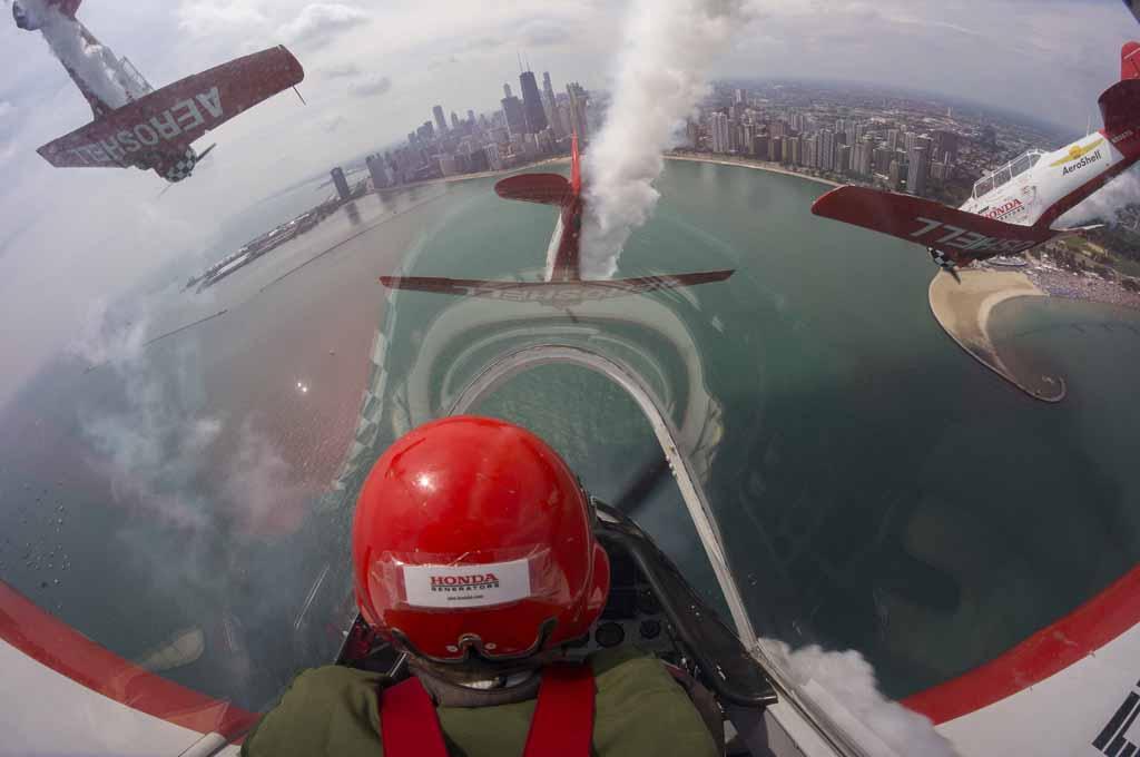 Aeroshell Aerobatic Team viewed from the cockpit of Gene McNeely during their performance at the 2014 Chicago Air & Water Show. By Dennis Biela.