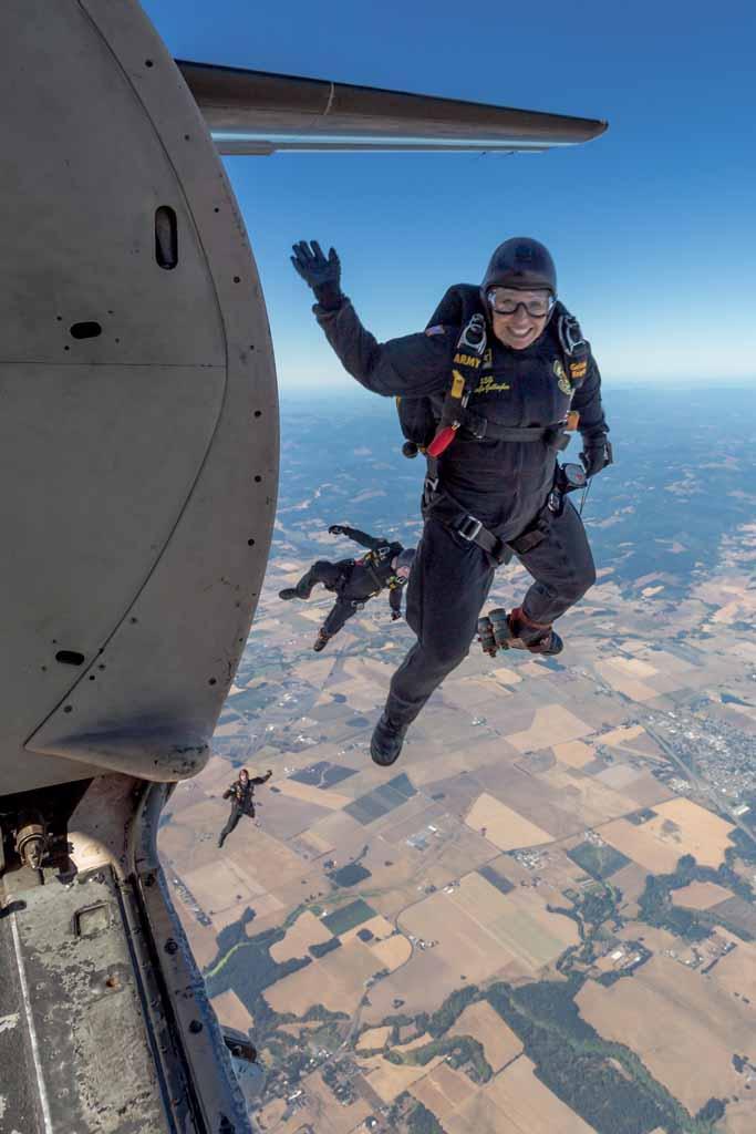 Seemingly having tremendous fun, these US Army Golden Knights parachutists demonstrate their skill and precision during a mass departure from the jump plane. By Evan Peers.