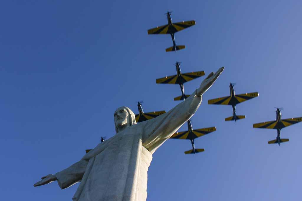 The Redeemer's Squadron: The Brazilian Air Force Acrobatic squadron, 'Esquadrilha da Fumaça,' flying over the statue of Christ the Redeemer in Rio de Janeiro. By Felipe Cruz.