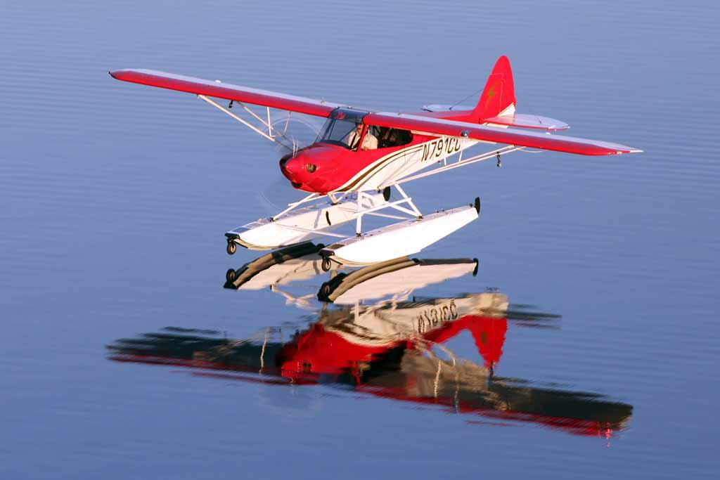 A CubCrafters Sport Cub equipped with Mead amphibious floats kisses the glassy waters near Polk City, Fla. Photo taken April 2, 2014. By Mariano Rosales.
