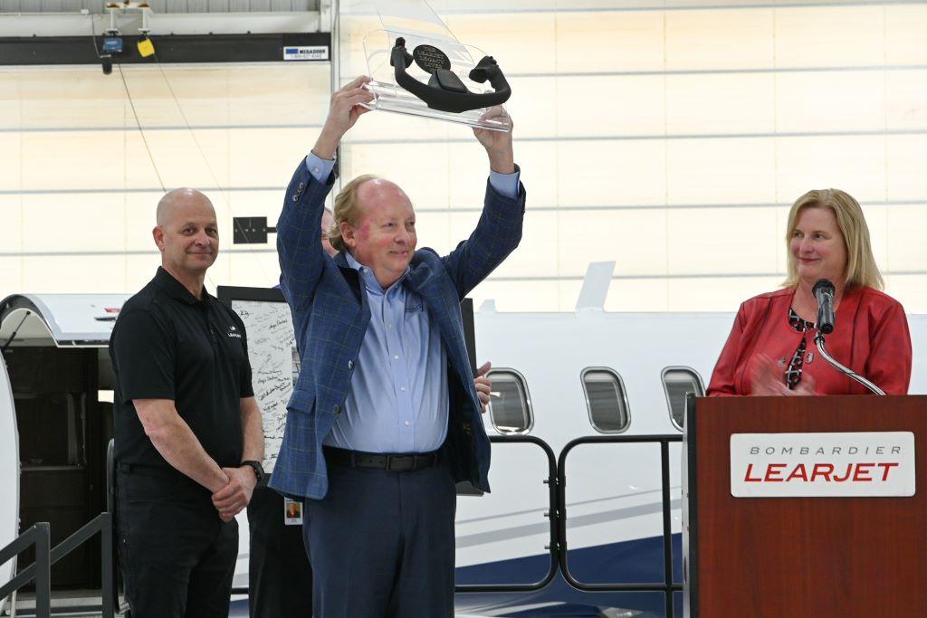 Bombardier delivered the final Learjet off the production line, an eight-passenger Learjet 75, to Charles Cox, CEO of Northern Jet Management at a ceremony at the Wichita site. Delivery ends six decades of production of the iconic jet, with 3,055 built. About 2,000 remain in service. Credit: Brett Schauff