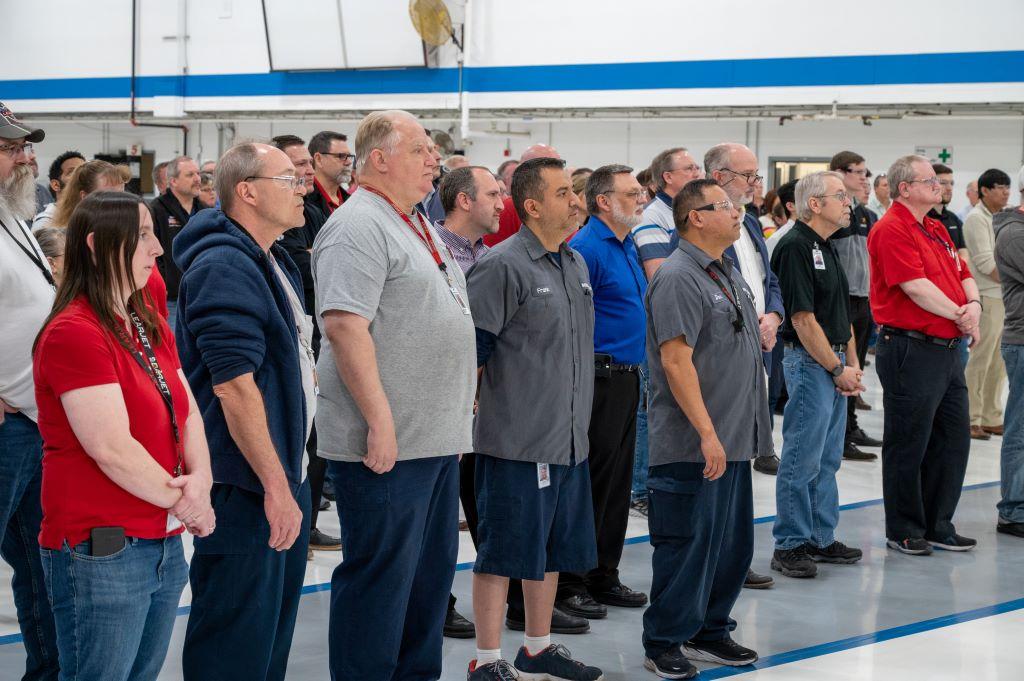 Wichita Learjet employees attend a delivery ceremony for the final Learjet to come off the production line. The site employs 1,100, including 400 hourly workers. All but about 50 employees on the assembly line were moved into other positions, according to Sudduth. Credit: Brett Schauff