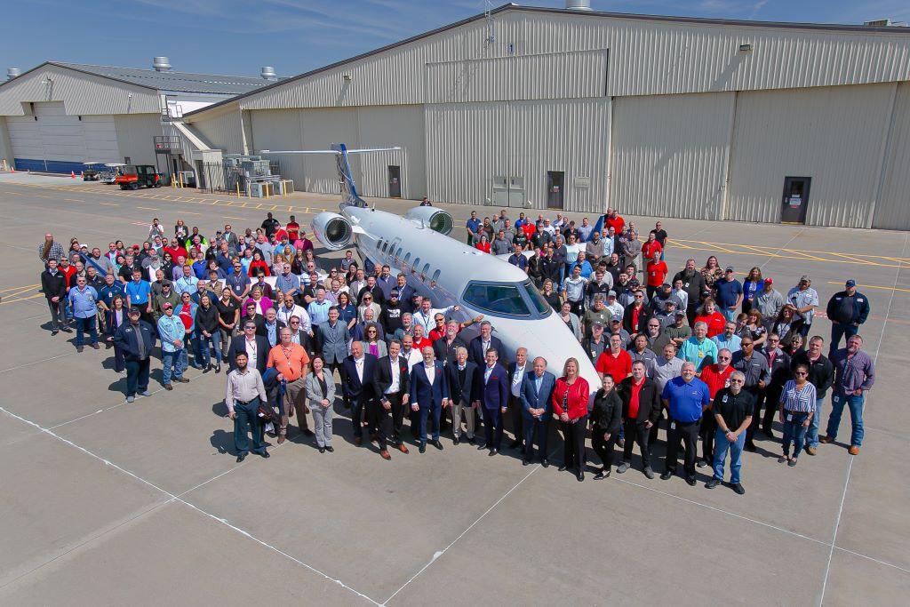 Employees, Bombardier executives and others pose with the final Learjet 75 outside Learjet’s Wichita hangar following the delivery ceremony. Bombardier CEO Eric Martel and other Bombardier executives plan to visit Wichita in April to honor the Learjet legacy and focus on the future. Although production has ceased, the facilities include a large service center, flight test center and special missions site. Credit: Bombardier