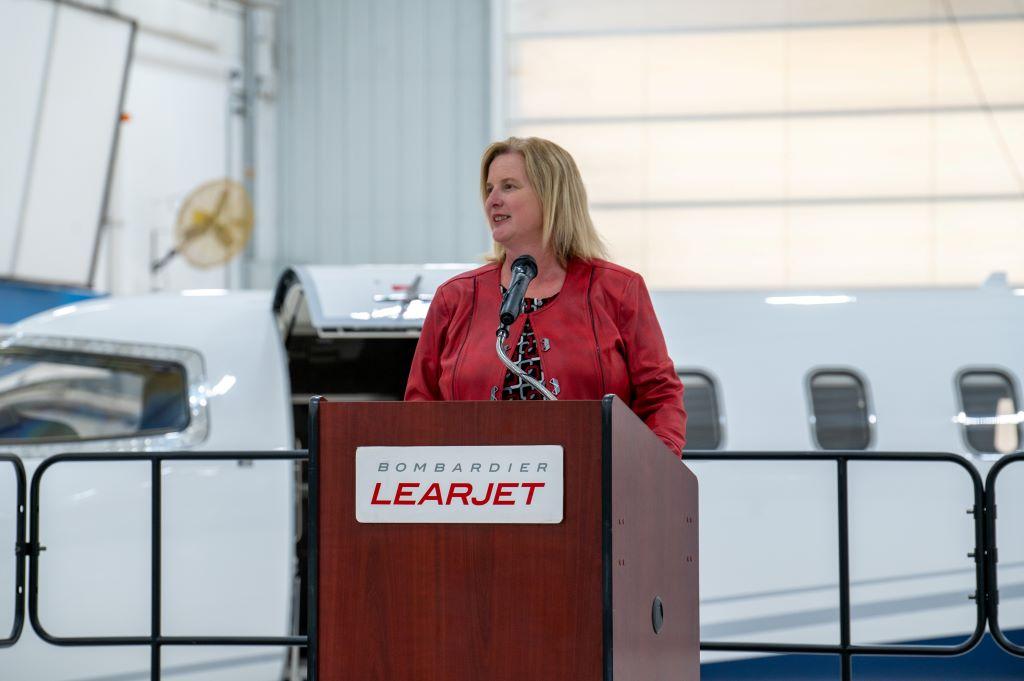 Tonya Sudduth, Bombardier Business Aircraft vice president of operations and head of the Wichita Learjet site, addresses employees, executives and others during a delivery ceremony March 28. “There’s no doubt that today is an emotional day for many of us as it marks the end of the production era of Learjet,” she says. “However, the emotion that is most prominent that I’ve seen in all my conversations with (employees) over the past several days and months is pride.” Credit: Brett Schauff