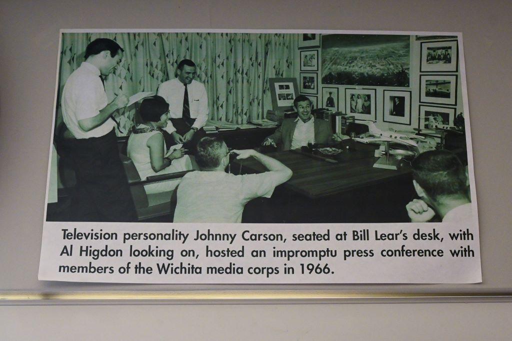 A photo of former talk-show host Johnny Carson hosting a press conference in the 1960s while sitting in Bill Lear's chair inside his office hangs in the spot of founder's original office.. Credit: Alex Unruh