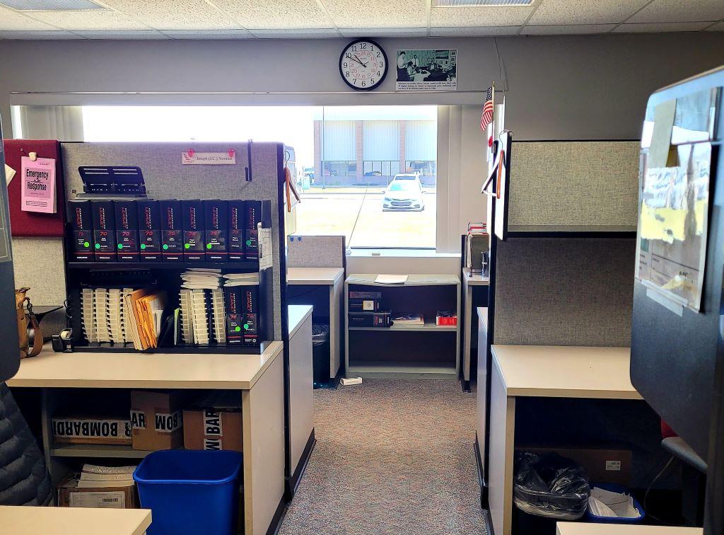 Learjet founder Bill Lear's original office has been remodeled into employee cubicles. A photo of former late-night talk-show host Johnny Carson taken inside Bill Lear's office marks the location. The photo is to the right of the clock above the window. Credit: Molly McMillin
