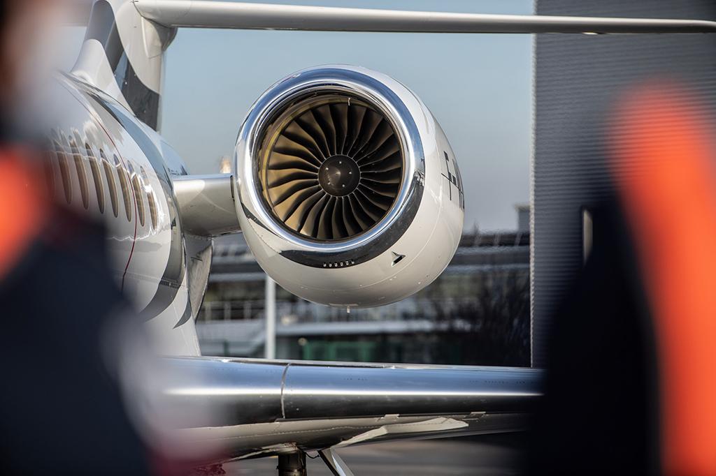 Following shipment by air from Canada, a PW812D engine is readied for installation on a Falcon 6X at Dassault’s Merignac factory outside Bordeaux, France.