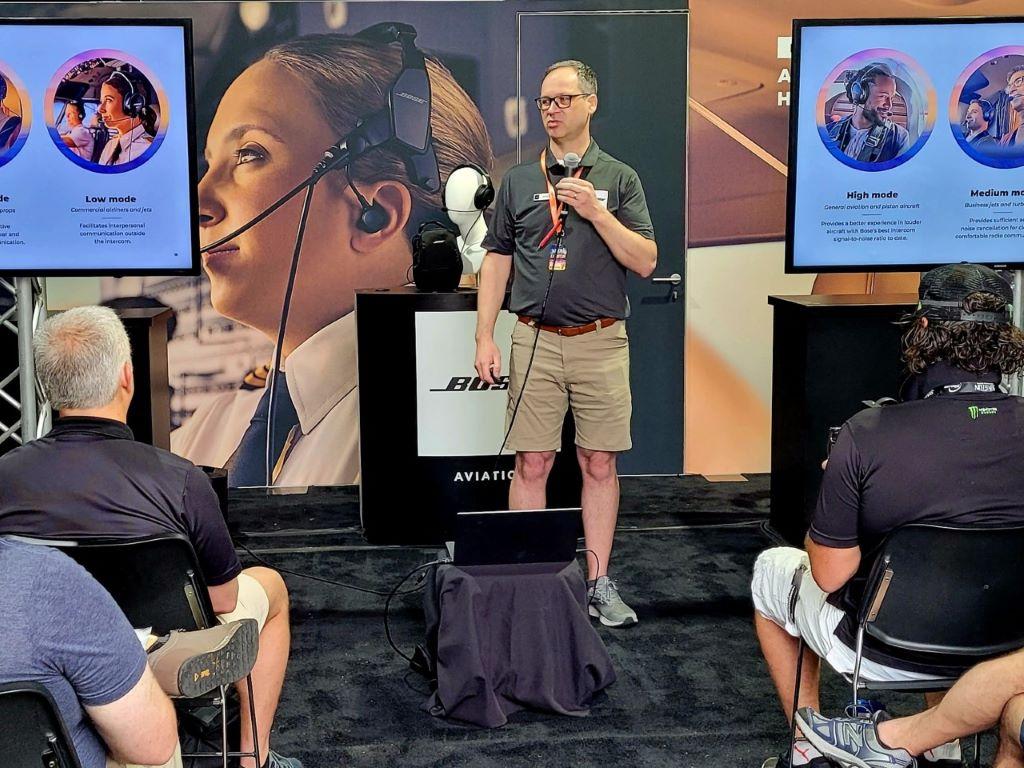 Bose kicked off Sun 'n Fun with a media event and the introduction of its latest headset, the A30. The A30 will replace the Bose 20 predecessor. Matt Rue, a pilot and senior product manager for Bose, noted the A30's benefits, which include a 20% reduction in clamping force, a noise reduction system and other features. Credit: Molly McMillin