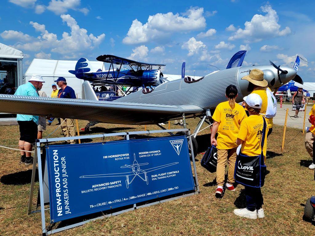 Junkers Aircraft unveiled the two-seat Junkers A50 Junior, an open-cockpit light sport aircraft, during Sun 'n Fun 2023 in Lakeland, Florida. The aircraft's fuselage is built from corrugated aluminum. The aircraft is a throwback to the 1920s. The Junkers A50 Junior was a German-built aircraft that made its first flight in 1929. The latest version includes modern avionics with the Garmin G3X avionics, dual flight controls, a 110 hp Rotax 912iS engine and a ballistic recovery parachute. It has a 75 kt. cruise speed and a range of 680 nm. Credit: Molly McMillin
