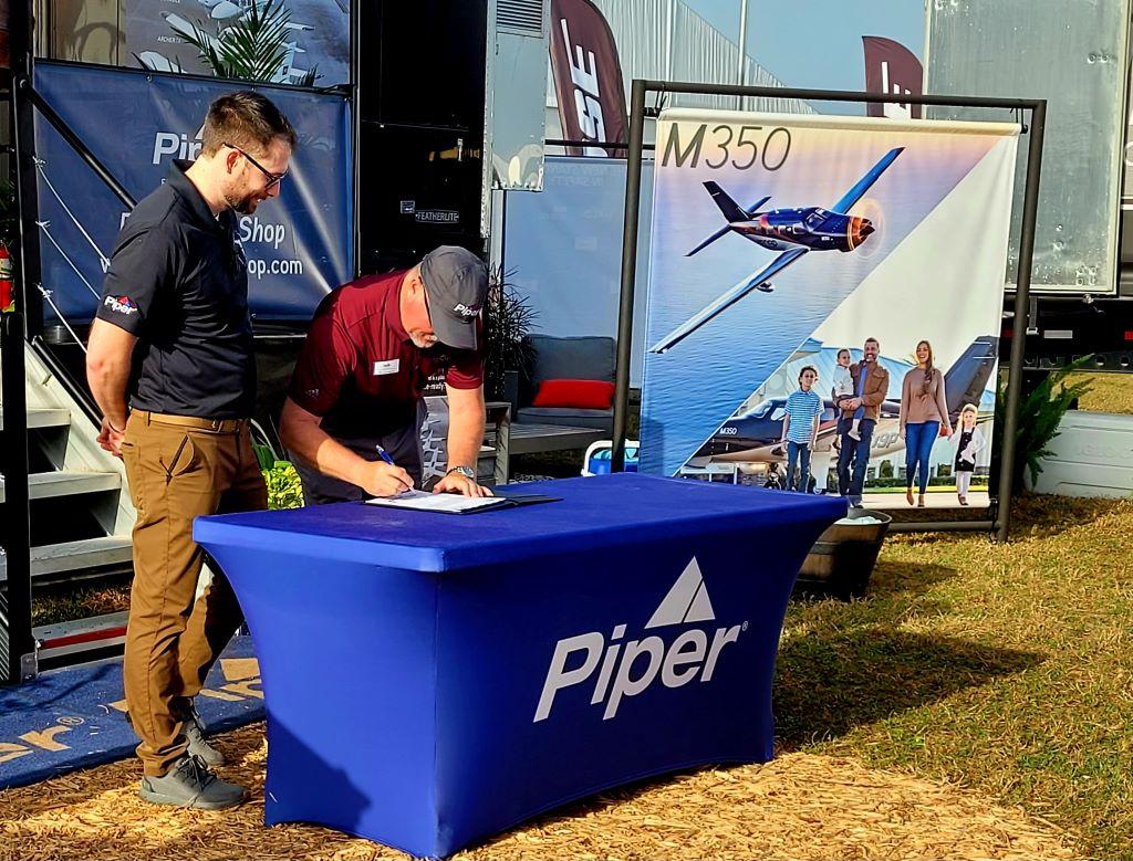 Ron Gunarson, Piper vice president of sales, marketing and customer support (right), signs a sales agreement with Blue Line Aviation for 55 Piper Archer TX and Seminole aircraft with an option for 60 more, during a press briefing at Sun 'n Fun Aerospace Expo in Lakeland, Florida. Adam Walters, president of Blue Line Aviation (left) says Blue Line's order of Piper aircraft represents a major change. Archers and Seminoles will eventually replace the flight school's fleet of Diamond trainers. Deliveries of Archer aircraft will begin in the second half of 2023, while Seminole deliveries will begin in 2024. Shipments will take place over the next four years. Credit: Molly McMillin