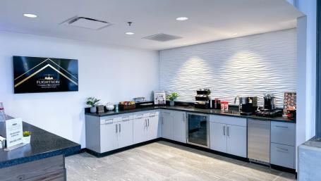 FlightServ’s 110,000 ft.² complex sits on 22 acres and includes an 80,000 ft.² heated hangar with 28-ft. high doors to accommodate private aircraft.