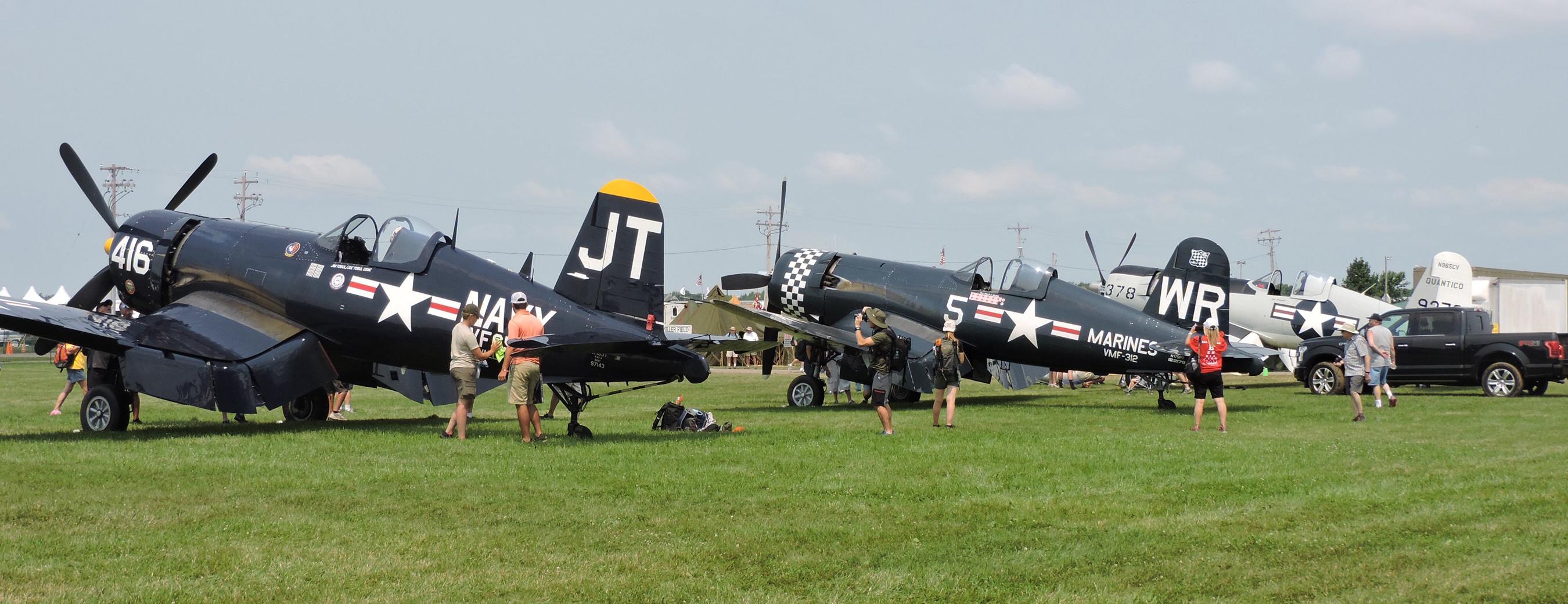 Three Corsairs grace the parking area at Oshkosh. The one most distant is an F4U-7 in a striking gray color scheme. It was used in the TV serial Baa Baa Black Sheep.