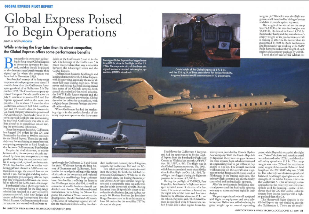 Our pilot and author David M. North took the long-range Global Express for a test flight and produced a pilot report as manufacturer Bombardier was to start delivering to corporate operators. He suggested that customers "should be pleased at the demonstrated performance they signed up for when the program was launched in December 1993".