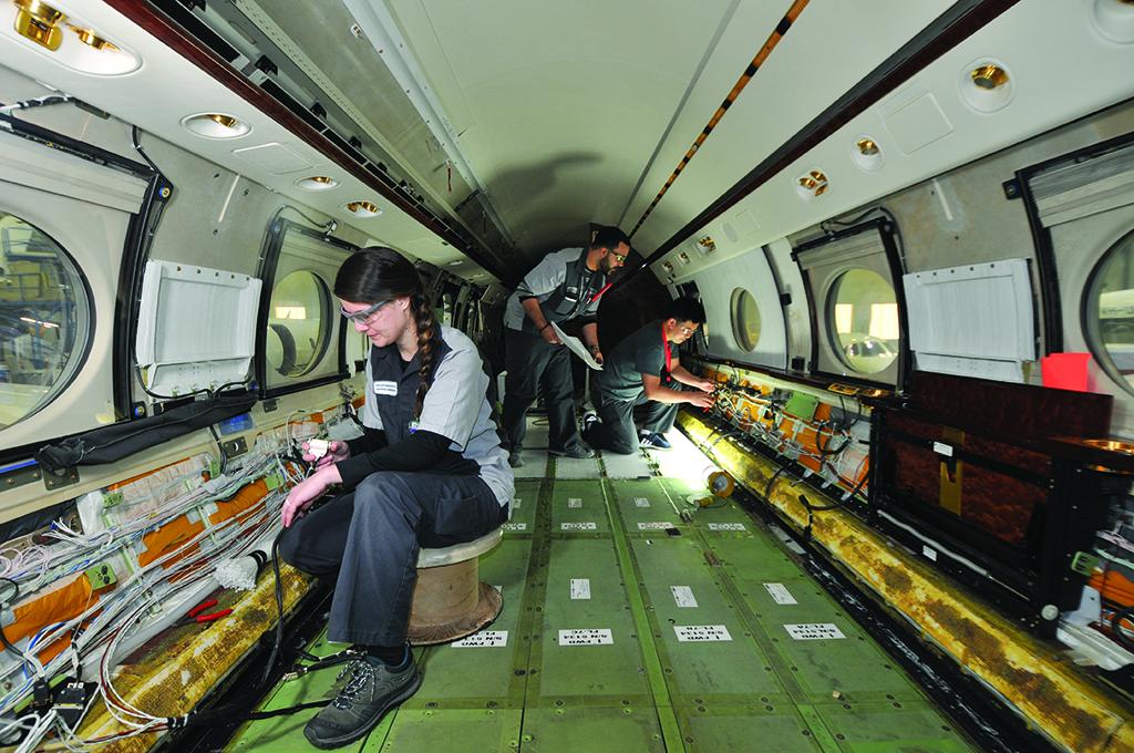 Duncan Aviation technicians install a CMS/cabin management system including wifi hardware in a Gulfstream business jet. The equipment “ensures that business aircraft passengers can be productive in flight, meaning they can stay connected with what is happening on the ground.”