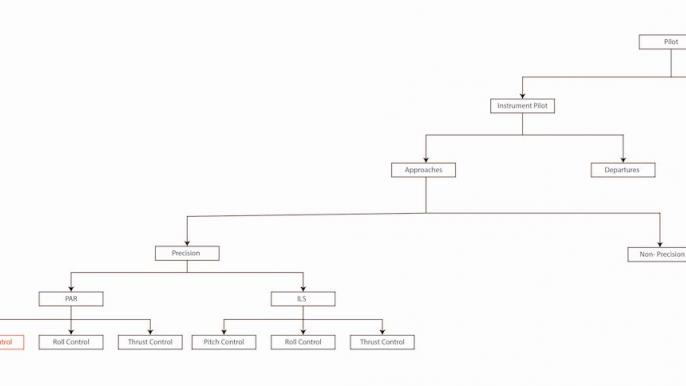 Let’s look at the issue from broad to specific with a diagram of where exactly pitch control falls into the big picture of instrument flying and pilot skills. The drawn diagram breaks down the PAR into pitch, roll and thrust control. Your skill as a PAR pilot breaks down into these elements. You need a similar skill set for an instrument landing system (ILS) approach and together they make up your precision approach capabilities. Alongside this, you have similar non-precision approach skills, which are not shown for simplicity. Now we have diagramed your instrument approach skills. Further up the tree we have departure procedure skills. Combined, these are what make you an instrument pilot. Of course, there are many skills needed to be a pilot, but we have isolated the very specific skill of controlling your pitch during a PAR instrument approach.