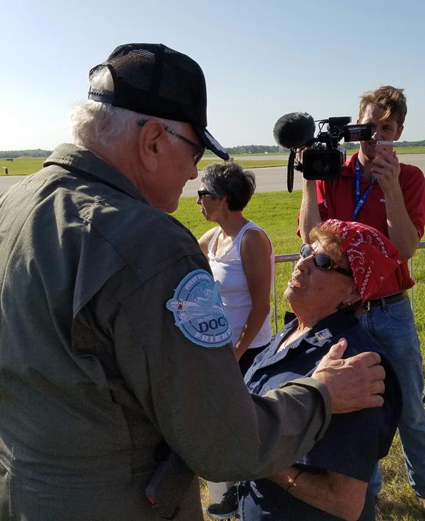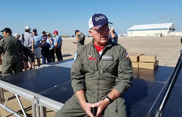 Charlie Tilghman, pilot-in-command, talks with reporters after the flight. He and several other Commemorative Air Force members participated in the flight.